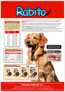 Rabito Adultos es un alimento balanceado y completo para perros adultos de alta performance, producido por Molinos Indelma S.A.
